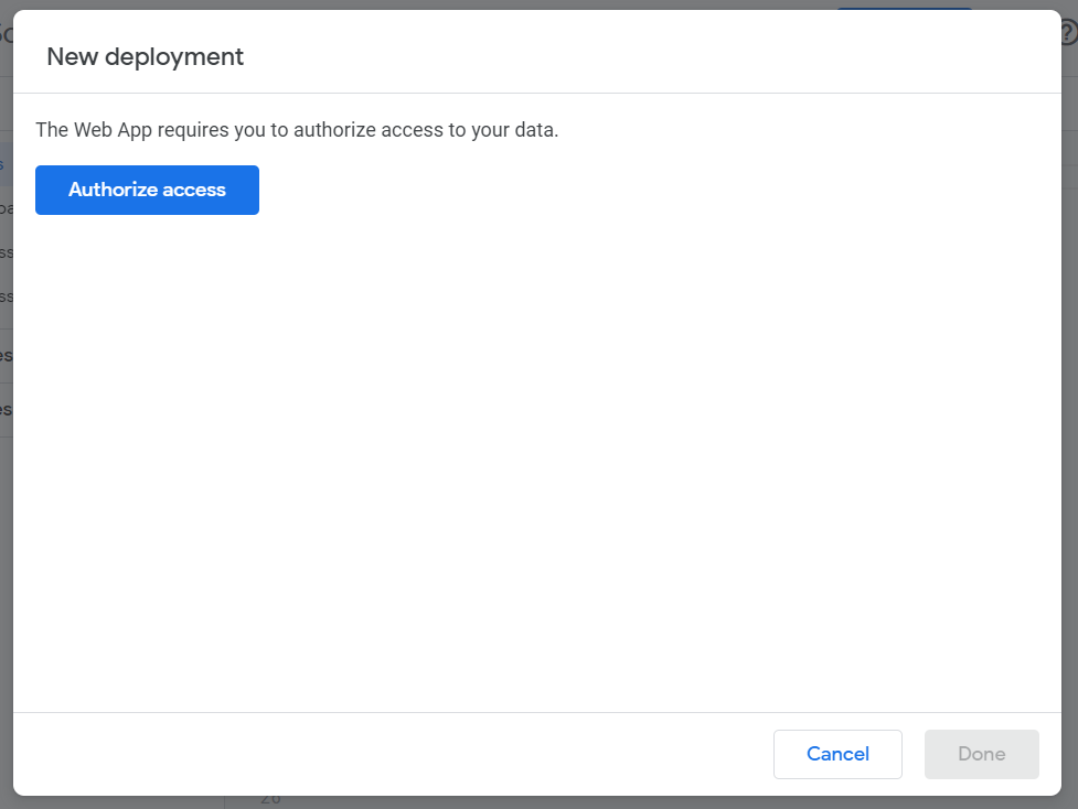 Když budete skript spouštět poprvé, Google Apps Script vás vyzve k autorizaci přístupu ke skriptu. Klikněte na Autorizovat přístup .