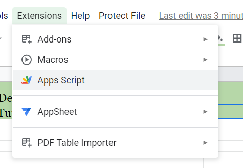 Chcete-li otevřít Google Apps Script, klikněte na Rozšíření na hlavním panelu nástrojů a vyberte Apps Script.