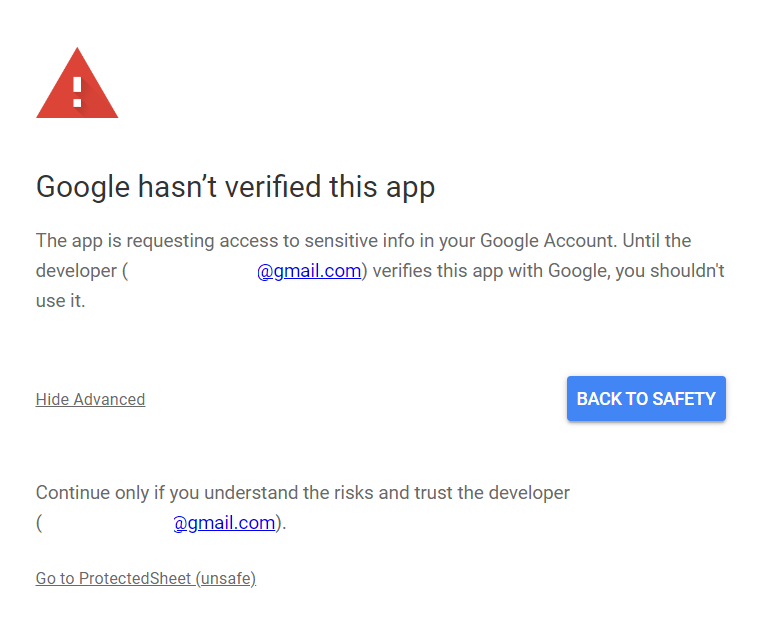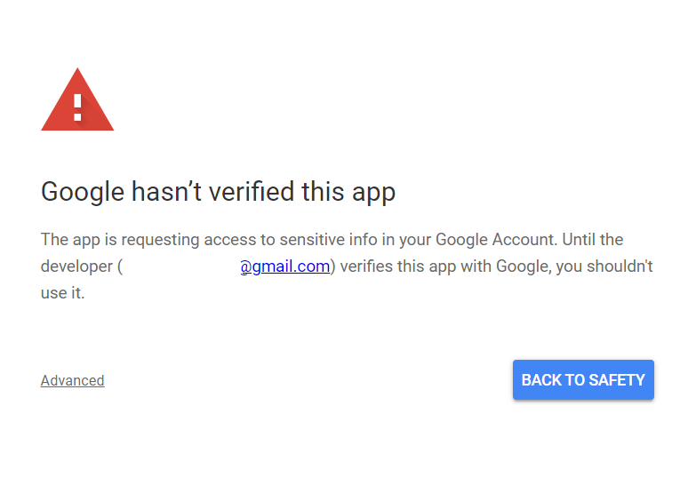 Načte se stránka, která vás informuje, že aplikace nebyla ověřena společností Google. Tato aplikace je však bezpečná.