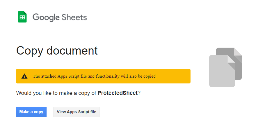 Odkaz vás vyzve k vytvoření kopie listu spolu s jeho soubory Apps Script a funkcemi. Klikněte na Vytvořit kopii .