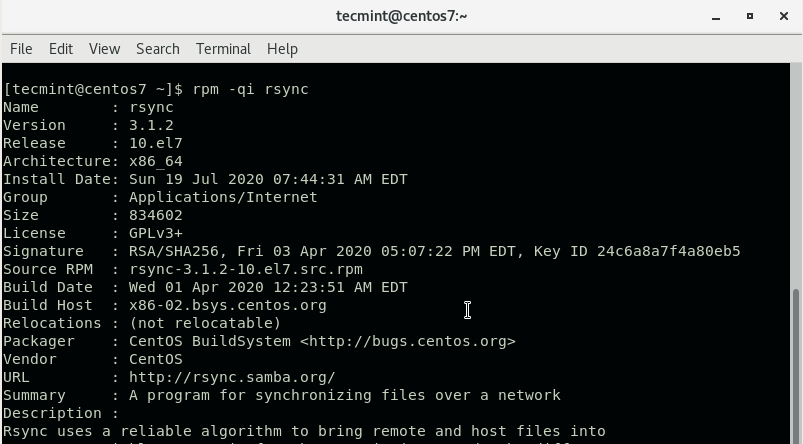 Pokud chcete zobrazit další informace o rsync, spusťte následující příkaz rpm :