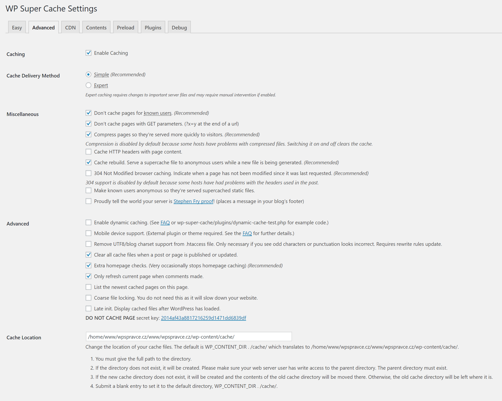 - Tajný klíč pro zobrazení necachovaných stránek (Do not cache page secret key) – zajišťuje, že můžete vidět přímo všechny stránky bez cache. Jedná se o debugovací nástroj.